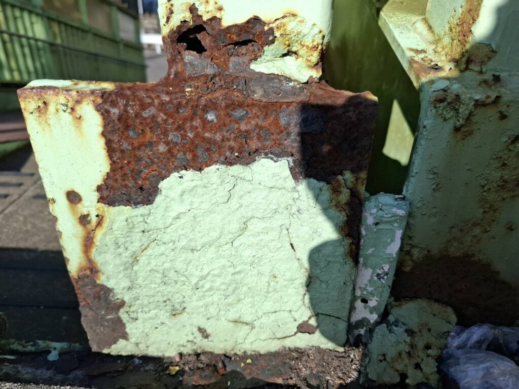 現地を確認したところ、長年の雨水や湿気の影響により鋼材が錆びてしまい、塗膜の剥離だけでなく、部分的に欠損や穴あきが見られる状態でした💦