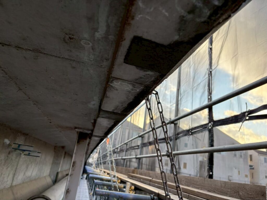 特に経年によるひび割れや、雨水の影響による断面欠損が確認されたため、適切な下地処理を行った上で補修・改善工事を実施しております!